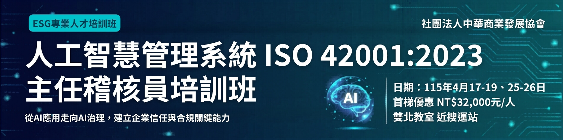 | ISO 42001:2023 人工智慧管理系統主任稽核員培訓班 | 4/17, 4/18, 4/19、4/25, 4/26 | 台北 | 首梯優惠價 : NT$32,000元 /人 會員或團報:NT$29,000元 /人 | 招生中 | 點擊報名 |