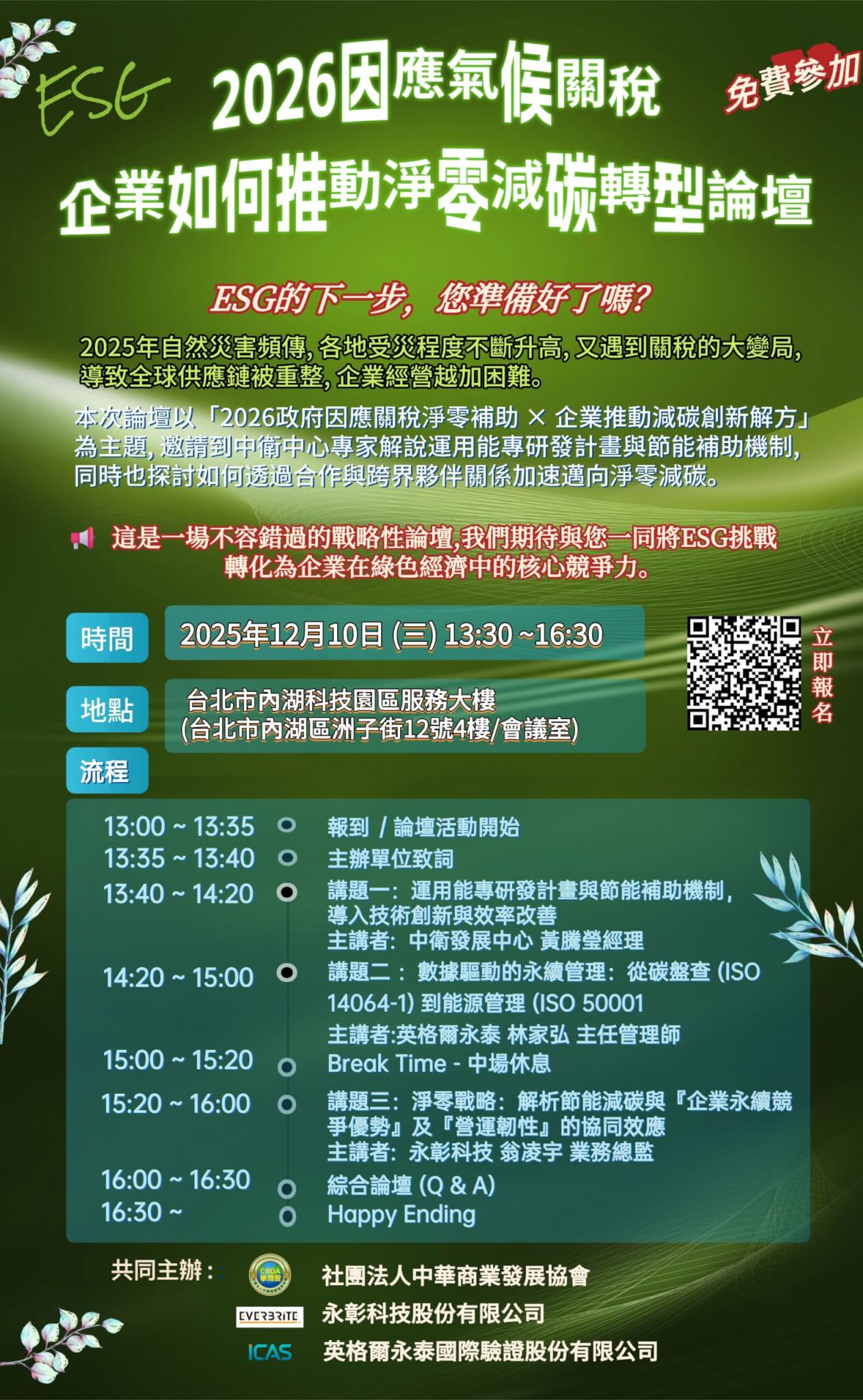 📢這是一場不容錯過的戰略性論壇,我們期待與您一同將ESG挑戰轉化為企業在綠色經濟中的核心競爭力。