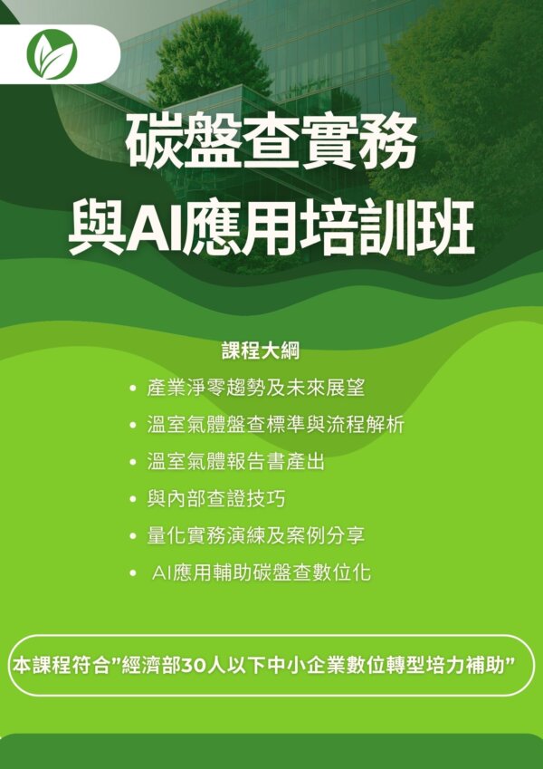 隨著全球淨零排放趨勢的崛起,如何順利進行碳盤查,成為企業邁向永續經營的關鍵。這門課程專為中小型企業設計,讓你輕鬆掌握碳盤查的實務技巧,並學會運用AI數位工具提升效率!