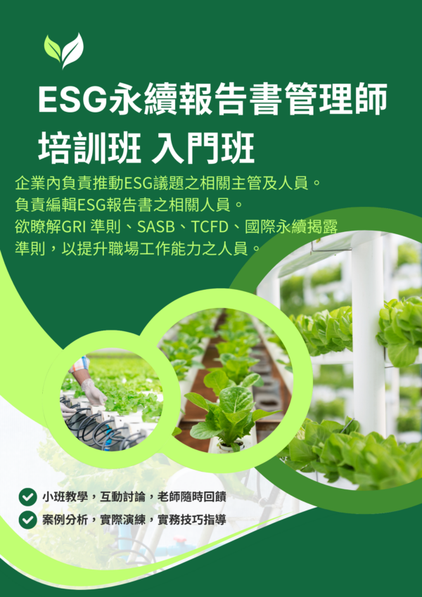 | ESG永續報告書管理師培訓班 | A入門班(1日), 菁英實戰班(3日) |